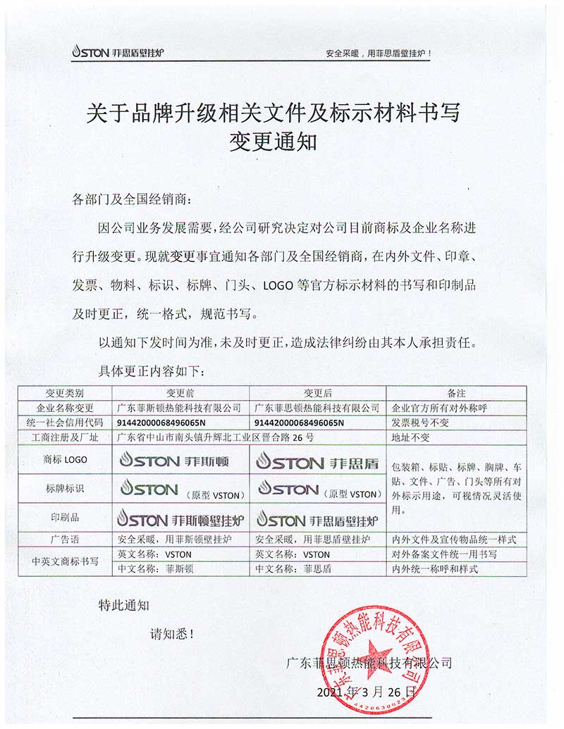 因公司業(yè)務(wù)發(fā)展需要,經(jīng)公司研究決定對公司目前商標(biāo)及企業(yè)名稱進(jìn)行升級變更。現(xiàn)就變革事宜通知各部門及全國經(jīng)銷商,在內(nèi)外文件、印章、發(fā)票、物料、標(biāo)識、標(biāo)牌、門頭、LOGO等官方標(biāo)示材料的書寫和印制品及時更正,統(tǒng)一格式,規(guī)范書寫。