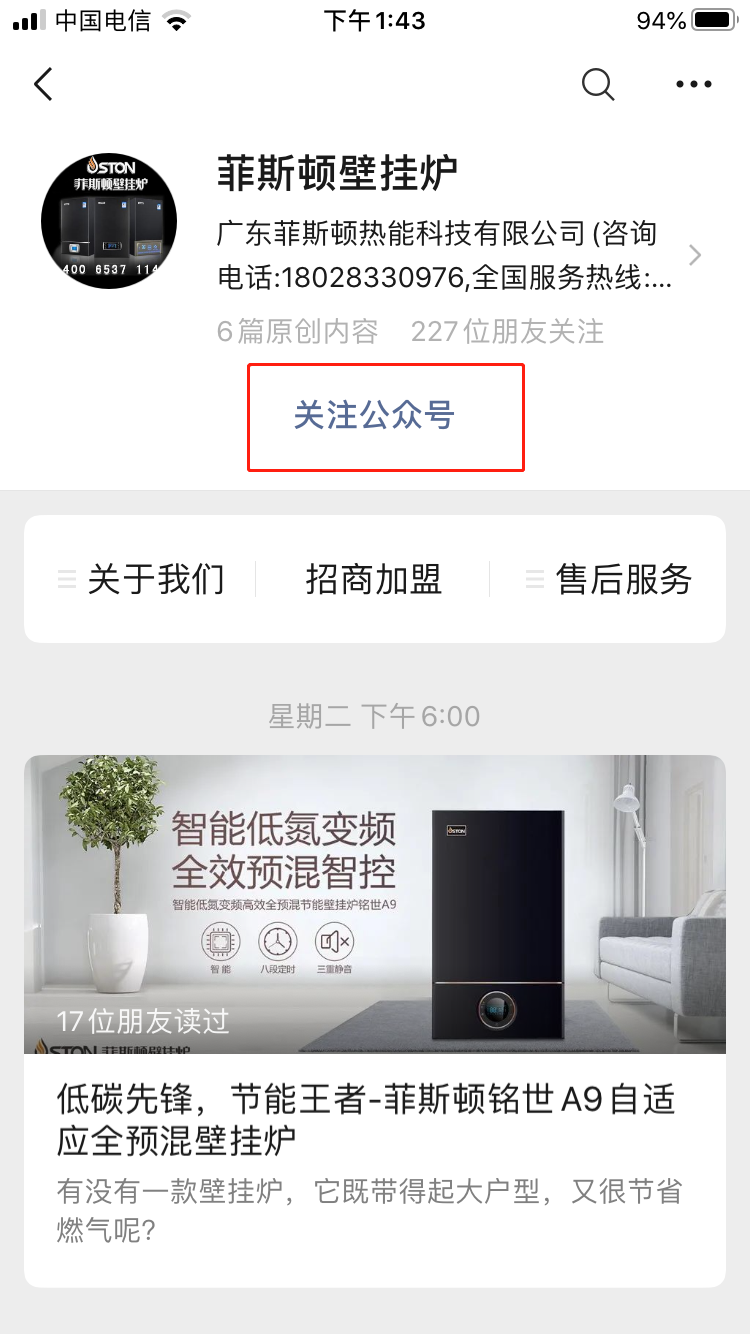 方法2:關注菲思盾壁掛爐的官方公眾號