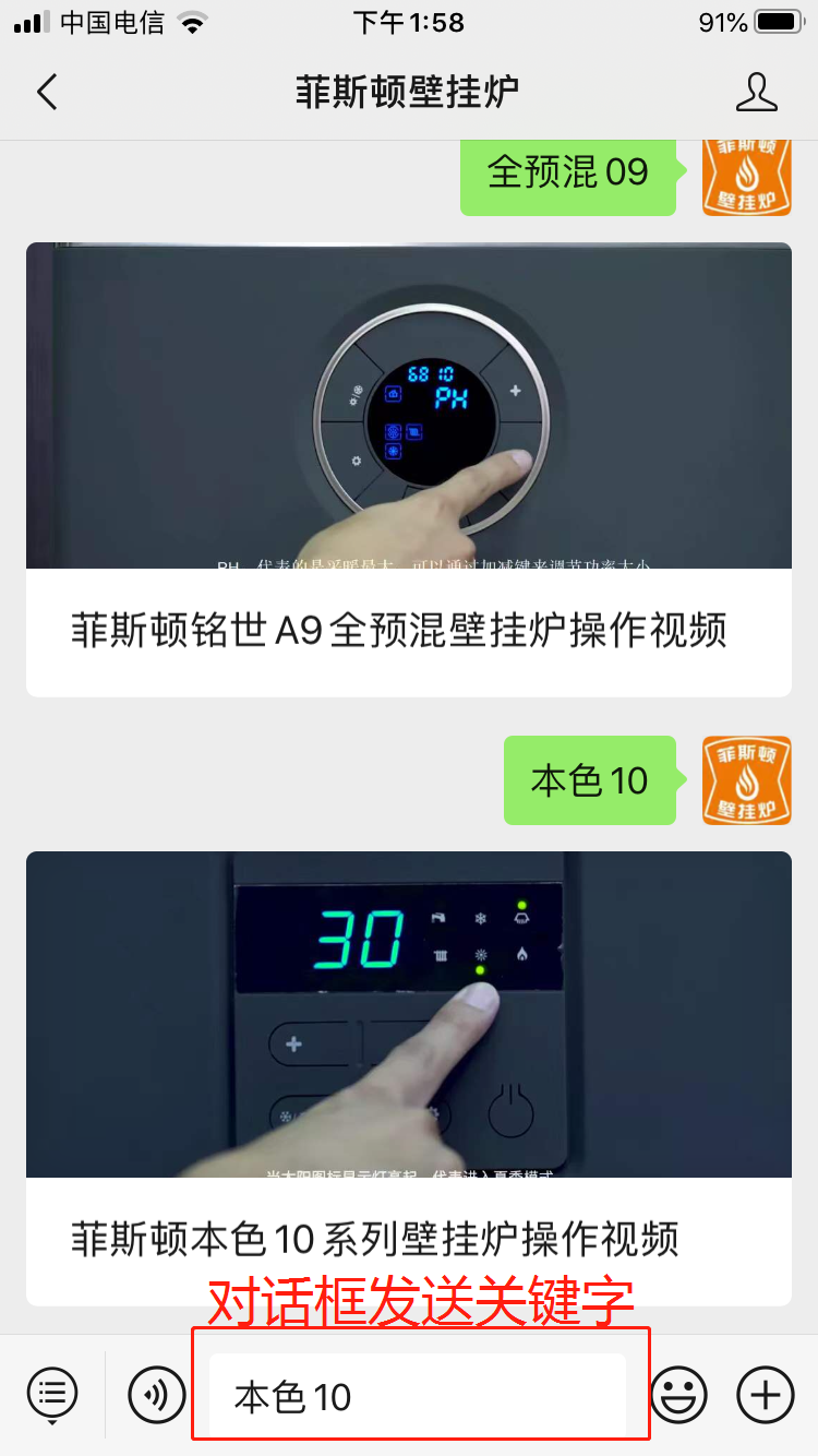 (首先您要查看您家的產品型號,如銘世A9全預混壁掛爐,即可到微信公眾號中,點擊菲思盾壁掛爐的公眾號,在聊天框內輸入“09”、“A9”、“全預混”等關鍵詞發送,操作視頻就出現在您眼前啦~)