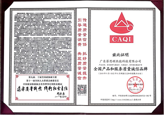 廣東菲思頓熱能科技有限公司作為質量誠信倡議企業,憑借自身過硬產品質量、貼心售后服務、不斷創新行業技術,通過嚴格評選與考核,最終榮獲多個產品質量誠信經營認可稱號。為全面提高產品和服務質量,提升國家質量競爭力,營造推動質量強國建設的良好社會氛圍作出表率作用。